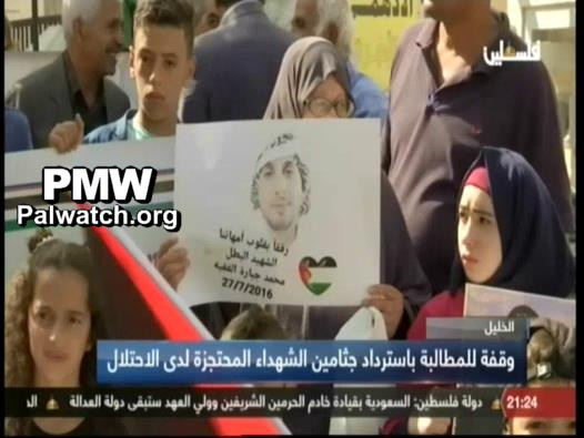Official PA TV newsreader: “The Supreme National Committee to Return the Bodies of the Martyrs (Shahids) (apparently refers to National Campaign to Return the Bodies of the Martyrs –Ed.) organized a rally at the Ibn Rushd Square in the center of Hebron to demand that the legal international organizations exert pressure on Israel to release their bodies.”