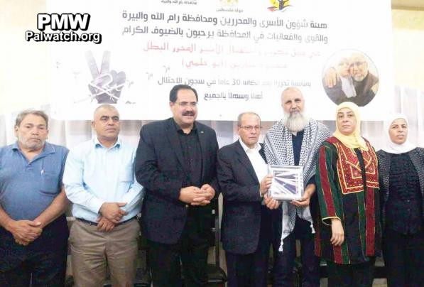 “Director of [PLO] Commission of Prisoners’ Affairs Qadri Abu Bakr and Ramallah and El-Bireh District Governor [Laila Ghannam]… honored heroic released prisoner Mahmoud Jabarin ‘Abu Hilmi’ (i.e., Israeli Arab who murdered a Palestinian he suspected of collaborating with Israel). This was during a tribute ceremony for his release, after he was in the occupation’s prison for 30 years.