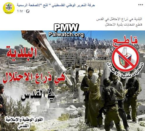 | Posted text: “The municipality is the arm of the occupation in Jerusalem Boycott the occupation’s municipal elections” The image shows Arab residents confronting Israeli soldiers as a building is being demolished. Text on left side of image: “The municipality is the arm of the occupation arm in Jerusalem The National and Islamic Forces in Jerusalem” | ![]() |