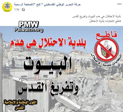 | Posted text: “The occupation’s municipality – the destruction of homes and the emptying of Jerusalem [of its Palestinian residents] Boycott the occupation’s municipal elections” The image shows a house being demolished. Text on left side of image: “The occupation’s municipality – the destruction of homes and the emptying of Jerusalem [of its Palestinian residents] The National and Islamic Forces in Jerusalem” | ![]() |