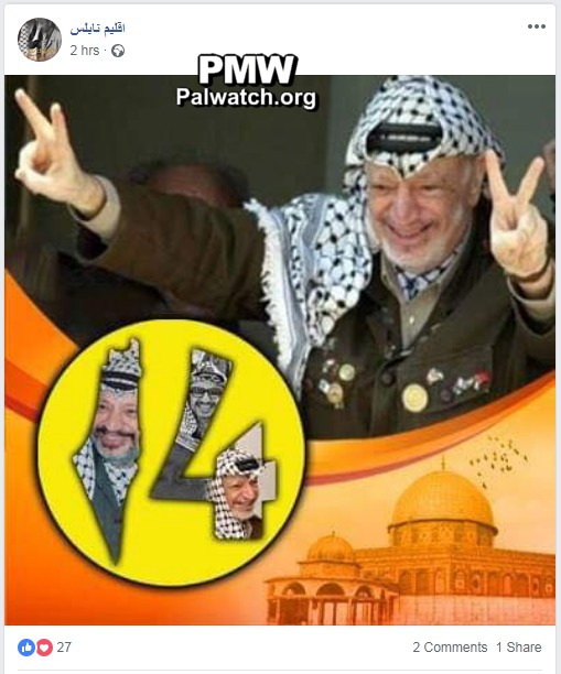 The upper part of the image shows former PLO and PA Chairman Yasser Arafat, and on the bottom right is the Dome of the Rock. On the lower left is the logo for the 14th anniversary of Arafat’s death, which consists of a large yellow circle containing the number “14,” with pictures of Arafat seen inside the number. The digit “1” is made out of the PA map of “Palestine” that presents all of Israel as “Palestine” together with the PA areas.