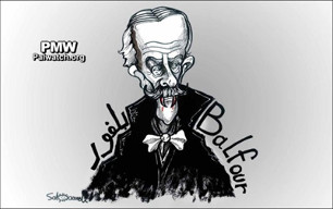 The cartoon shows former British Foreign Secretary Arthur Balfour depicted with bloody vampire fangs, and wearing a black Count Dracula cape.