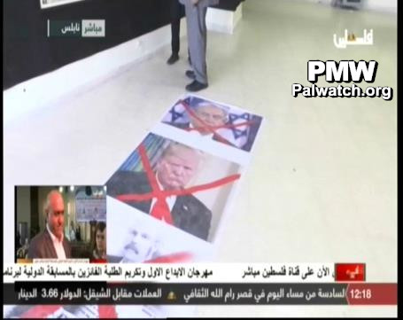 Pictures of Trump and Netanyahu with red crosses on their faces at event honoring Arafat at Nablus branch of Al-Quds Open University