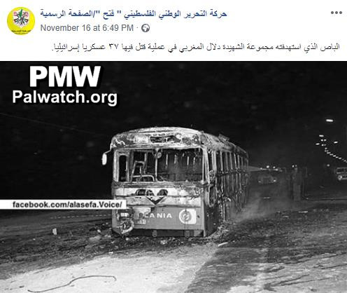 Fatah posts picture of bus from Coastal Road Massacre, in which Dalal Mughrabi led murder of 37, incl. 12 children, calling victims “Israeli military personnel”