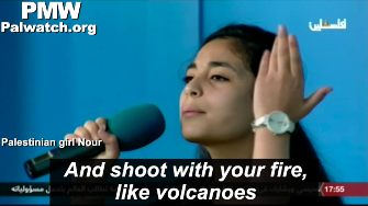 In the same episode of the program, a girl recited a poem denying Israel's right to exist with the words: "A Zionist stole the land of Palestine." The poem speaks of the Palestinians becoming "refugees" "70 years ago" - in other words, in 1948 when the State of Israel was created. Palestinian children are taught to deny Israel's right to exist since its creation in 1948, and not in the borders of 1967 as the PA claims in international circles. This education does not leave room for Israel in any borders. The poem encourages Palestinians to "rebel" and "shoot with your fire, like volcanoes," so that they will be "victorious" and "return." Upon hearing this poem, the PA TV host ensured her audience of children that "we are returning. Soon, Allah willing, we will return to our land":