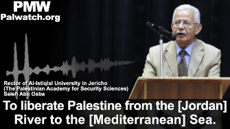 Another Palestinian way of saying that all of the State of Israel is “Palestine” is to describe it as stretching “from the Jordan River to the Mediterranean Sea.” This is one of the PA's popular slogans. Recently it was repeated by a university lecturer who described the “great Palestinian dream”: | |