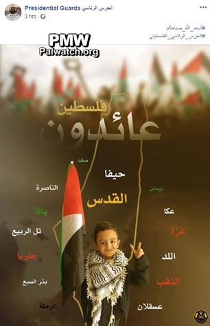 The photo above is a prime example of this. The Palestinian Authority Presidential Guards posted this image of a young boy making the “V” symbol for “victory” while holding a Palestinian flag. Behind him is the PA map clearly named “Palestine” that includes all of Israel and the PA areas. The names of the following Israeli cities and regions are written in the colors of the Palestinian flag on and around the map: “Haifa,” “Jerusalem,” “Safed,” “Nazareth,” “Jaffa,” “Tal Al-Rabia (i.e., Tel Aviv, see note below),” “Tiberias,” “Be’er Sheva,” “Ramle,” “Ashkelon,” “the Negev,” “Lod,” “Acre,” and “Beit Shean.” “Gaza” is also marked. The text on the image, states that Palestinians will “return”: