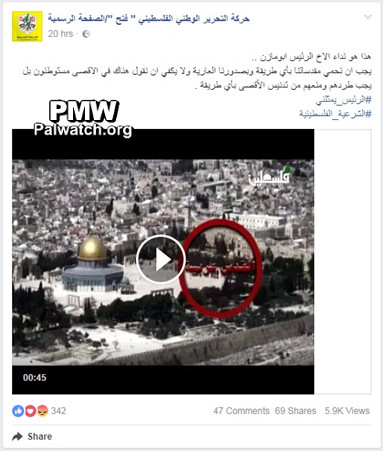 Fatah Facebook rebroadcasts Abbas` call to prevent Jews "in any way" from “defiling our holy places”