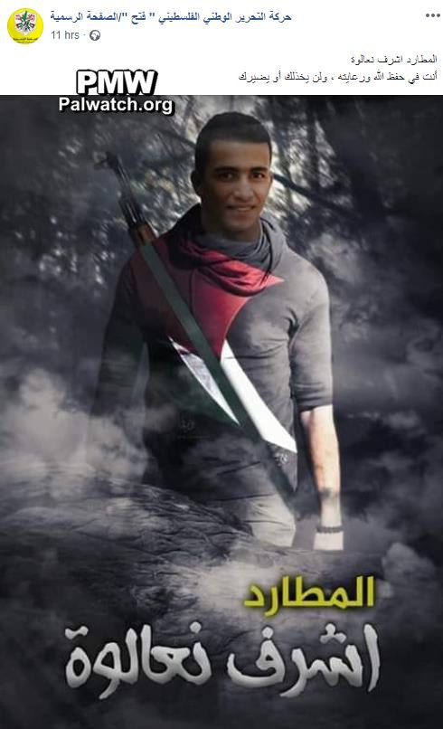 The image shows terrorist Ashraf Na’alwa, who murdered 2 Israelis on Oct. 7, 2018, and has not yet been apprehended as of Dec. 11, 2018. The image has been photoshopped so that Na’alwa is seen with a rifle slung over his shoulder and a Palestinian flag design on his chest.