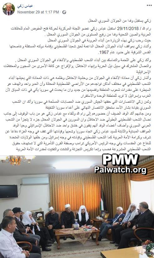Posted text: "Fatah Movement Central Committee member and [Fatah] General Commissioner for Arab and China Relations Abbas Zaki received a high level delegation from the occupied Syrian Golan…