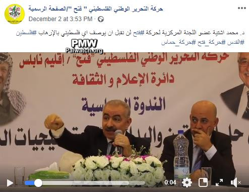 Posted text: “Fatah Movement Central Committee member [and Fatah Commissioner of Treasury and Economy] Muhammad Shtayyeh: Fatah will not agree to any Palestinian being defined as a terrorist. #Palestine #Jerusalem #The_Fatah_Movement #The_Hamas_Movement”