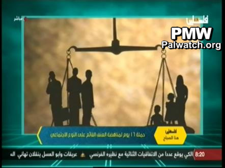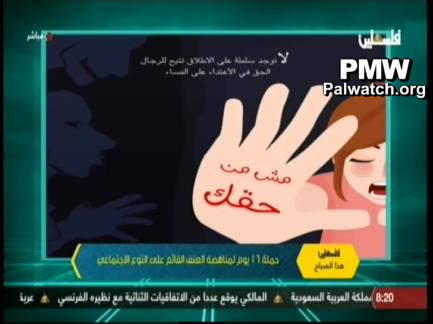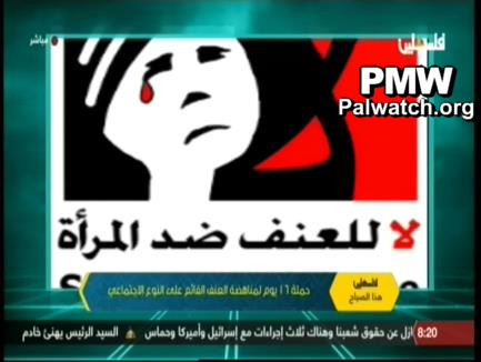 Visual: During a conversation with Campaign Liaison and Support Director for the Palestinian Working Woman Society for Development Sandy Hanna, PA TV showed images from the campaign with the following messages condemning violence against women: