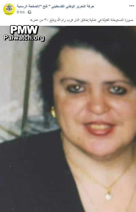 The picture shows a woman that the official Fatah Facebook page claims was murdered in the terror attack near Ofra on Dec. 9, 2018. At the time of the posting of the picture no one injured in the attack had died. The photo is apparently that of an Israeli woman in her 50ies who went missing a few days before the attack, according to Russian websites.