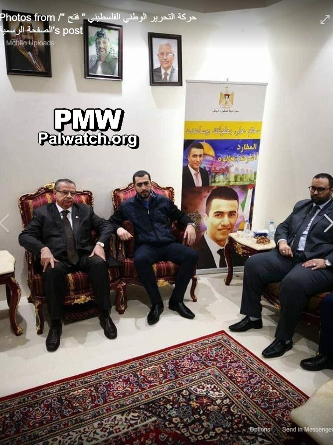 With the participation of an audience from among the members of the Palestinian community in Riyadh, [the embassy] is establishing a place of mourning (i.e., receives mourners at the embassy) for Martyr (Shahid) Ashraf Na’alwa (i.e., terrorist, murdered 2). The consolers were received by His Honor [PA] Ambassador [to Saudi Arabia] Bassem Al-Agha, the Martyr’s brother, and the embassy staff.”