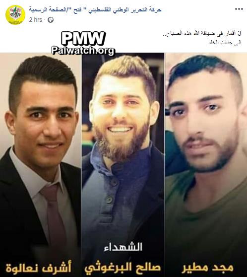The image shows (left to right) terrorists Na'alwa, Barghouti, and Mteir.Similarly, Fatah's branches in the West Bank stated in a press release that the organization accompanies its "heroic Martyrs" to "their weddings." A Martyr's funeral is considered a wedding to the 72 Virgins in Paradise in Islam. In the same release, Fatah called on Palestinians to "escalate the confrontation":