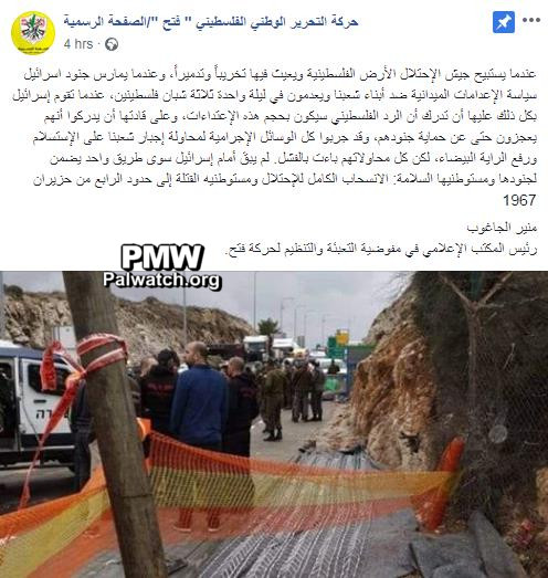Posted text: "When the occupation army soldiers do as they please on the Palestinian land and sow ruin and destruction in it, and when Israeli soldiers implement a policy of summary executions against the members of our people and execute three young Palestinians in one night (refers to terrorist murderers Ashraf Na'alwa and Saleh Barghouti who were killed resisting arrest, and terrorist Majdi Mteir who was killed while committing a stabbing attack; see notes below -Ed.), Israel must understand that the extent of the Palestinian response will be according to the extent of these attacks. Its leaders must understand that they are unable to defend even their soldiers (refers to Givat Assaf attack in which 2 Israeli soldiers were murdered -Ed.). They have attempted all of the criminal means to force our people to submit and wave a white flag, but all of their attempts have failed. Only one path remains for Israel that will ensure the wellbeing of its soldiers and settlers: full withdrawal by the occupation and its murderous settlers to the June 4, 1967 borders.