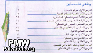 This image was taken from the schoolbook's table of contents. This group of chapters is entitled “Palestine My Nation.” The map, which shows both Israel and the Palestinian territories, gives the false impression that “Palestine” covers the area of Israel.