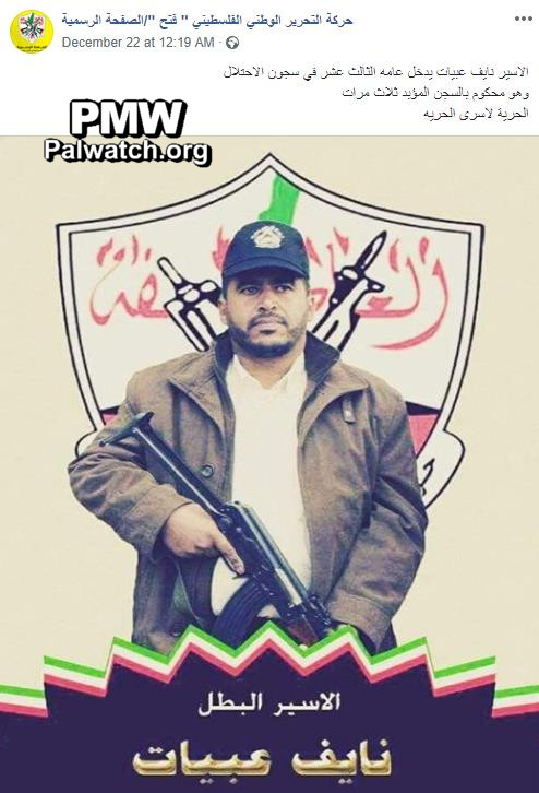 Text on image: “Heroic prisoner Naif Abayat (i.e., terrorist, involved in murder of 2)”