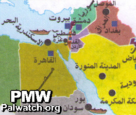 The map shows in orange what the schoolbook calls “Palestine.” It includes all of Israel and the Palestinian areas. In addition, the map shows Jerusalem as the capital of “Palestine.”