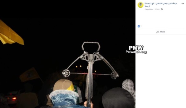 The image shows the same man holding a crossbow. To the right another is wearing the Palestinian flag.