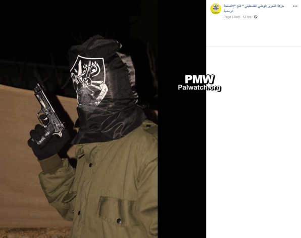 The image shows a man in uniform with his face covered by a mask bearing the Fatah logo holding a handgun.