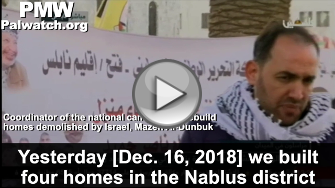 Coordinator of the national campaign to rebuild homes demolished by Israel Mazen Al-Dunbuk: Yesterday [Dec. 16, 2018] we built four homes in the Nablus district for the heroes of the Itamar operation in Beit Furik (i.e., terror attack, 2 murdered), and now the families are living in their homes. The headline of this campaign is the family of heroic Martyr Ashraf Na'alwa (i.e., terrorist, murdered 2) and the family of prisoner Nasser Abu Hmeid (i.e., terrorist, responsible for murder of 7).