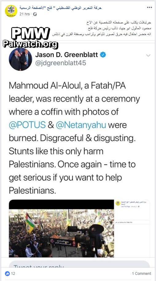 The image shows a tweet by US Envoy to the Middle East Jason Greenblatt following PMW’s bulletin documenting Fatah official Al-Aloul’s participation in burning of coffin with photos of Israeli PM Netanyahu and US President Trump. Greenblatt’s tweet included a screenshot from the official Fatah Facebook page showing the event where a “coffin” was burned with pictures of US President Donald Trump and Israeli Prime Minister Benjamin Netanyahu on it with their faces crossed out.