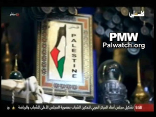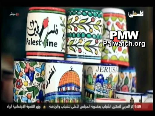 Visual: Various decorative items are shown bearing the PA map of “Palestine” that presents Israel as “Palestine” together with the PA areas, in the colors of the Palestinian flag and with the word “Palestine” in English.