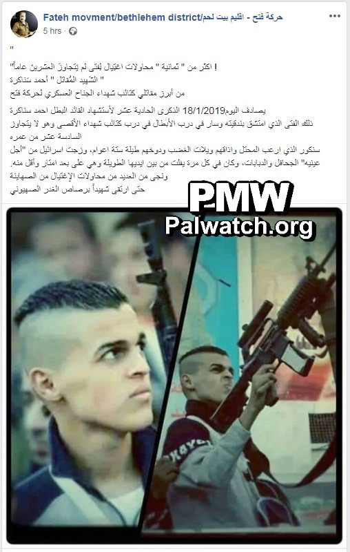 Today, January 18 [2019], is the 11th anniversary of the death as a Martyr of heroic commander Ahmed Sanaqrah. This young man – who took a rifle and followed the path of the heroes, the path of the Al-Aqsa Martyrs' Brigades – was not yet 16 years old.