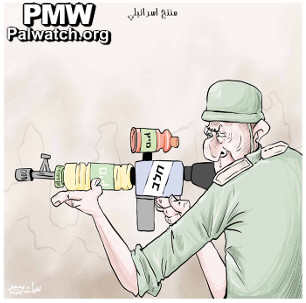 This cartoon in the official PA daily transmits the same message, showing an Israeli soldier holding a rifle made up of Israeli products: