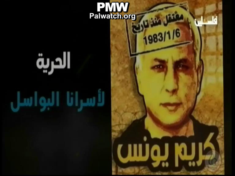 Commemorating the anniversary of Karim Younes' arrest, official PA TV honored him in a filler that it broadcast several times. It included this poster of him, referring to him and other terrorist prisoners as "brave":