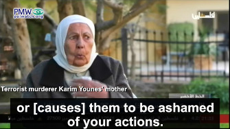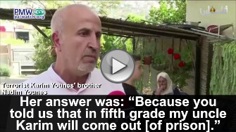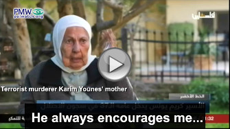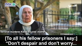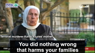 Moreover, official PA TV hosted Karim Yones' mother who spoke directly to her murderer son, telling him he "did nothing wrong" and that he and the other terrorist prisoners make Palestinians "proud":