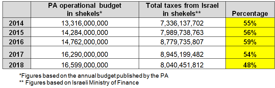 - PA to refuse approx. $2.2 billion (8 billion shekels) transfer of taxes from Israel in 2019, because Israel decided to deduct approx. $139.5 million (502 million shekels) that the PA uses to reward terrorists