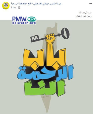 The image shows the text “The Gate of Mercy is ours” with a hand holding a large key extending from one of the letters on top. Behind the words is the PA map of “Palestine” that presents all of Israel as “Palestine” together with the PA areas. The image refers to a compound near the Gate of Mercy of the Temple Mount being closed after the Jordanian Waqf violated a court order by reopening it; see note below.