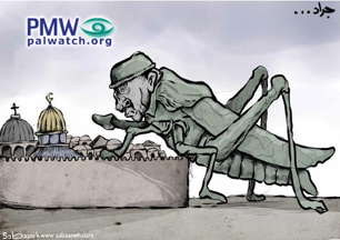 The cartoon shows a massive locust with the head of an Israeli/Jewish soldier – indicated by the large nose - wearing a helmet climbing over the wall of the Old City of Jerusalem, towards the Dome of the Rock and the Church of the Holy Sepulchre.