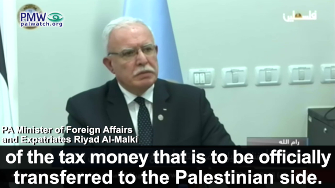 Bishara said this yesterday [Feb. 21, 2019] at a joint press conference with [PA] Minister of Foreign Affairs and Expatriates Riyad Al-Malki, following a meeting with consuls and representatives of European Union states in order to explain the consequences of the Israeli decision to deduct the government’s payments to the families of the prisoners, Martyrs, and wounded from the tax money (refers to implementation of law to deduct terrorist salaries from PA tax money; see note below -Ed.), and he added: ‘There is an official decision that was made yesterday, Wednesday [Feb. 20, 2019], not to accept the tax money if even a single penny is missing from it.’ ...