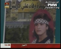 This picture of Wafa Idris with the text "The Shahida (Martyr) Wafa Ali Idris" appears in the new PA TV music video, which blends scenes and pictures paying tribute to the PLO, Fatah, Yasser Arafat and PA and Fatah Chairman Mahmoud Abbas. PA TV is under the control of Abbas's bureau.