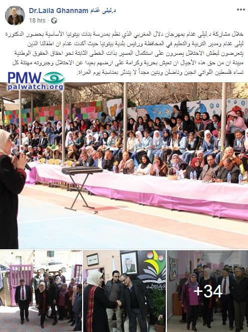 Posted text: "During her participation in the Dalal Mughrabi (i.e., terrorist who led murder of 37, 12 of them children) Festival, held at the Beitunia Elementary School for Girls in the presence of the director of the district's Education Directorate (i.e., branch of the PA Ministry of Education) and the mayor of Beitunia, [District Governor of Ramallah and El-Bireh] Dr. Laila Ghannam emphasized that our children, who are suffering from the occupation's brutality, are determined to continue on the path with the same certain steps, towards the realization of the national rights. She explained that it is the right of these generations to live in freedom and dignity on their land, far from the occupation and its tyranny. On the occasion of [International] Women's Day, Ghannam blessed all the women of Palestine – who have brought children into the world, fought, and built glory that will not be erased."