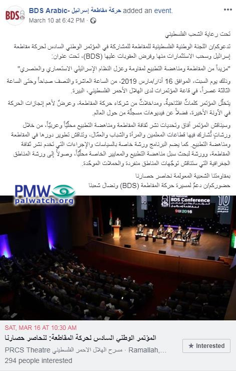 Since the anti-Israel BDS event is scheduled to be held tomorrow, on March 16, Palestinian Media Watch calls on the IFRC and the ICRC to act immediately and to do all that is in its power to prevent the event from being held on the premises of the PRCS.