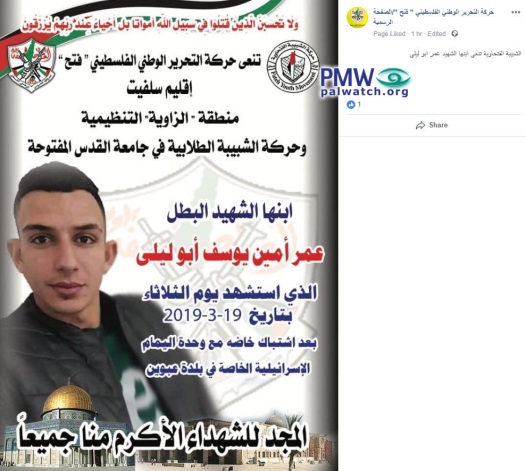 Fatah’s youth movement eulogizes terrorist who murdered 2 as a “heroic Martyr”
