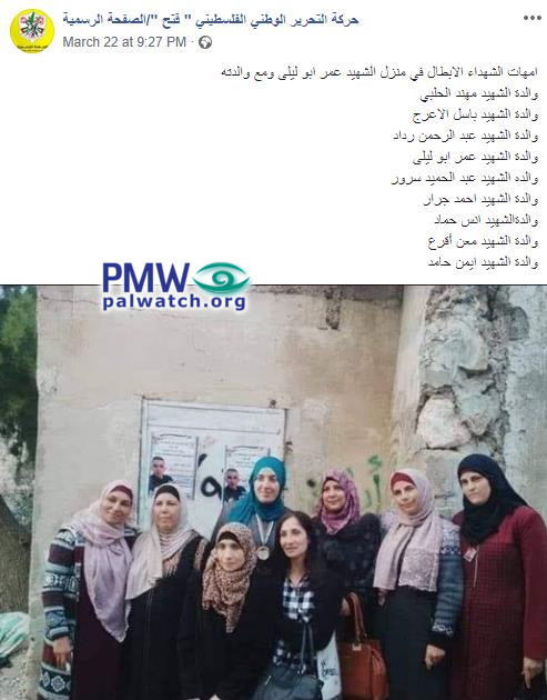 Image and text posted on the official Fatah Facebook pageThe image shows a group of eight Palestinian mothers of terrorists. On the wall behind them are posters featuring a picture of terrorist Omar Abu Laila who murdered 2.