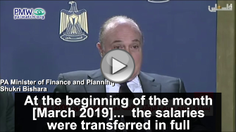 Palestinian Media Watch reported on the PA's decision to cut the salaries of the law-abiding PA employees, which came in response to the decision of Israel's Security Cabinet to implement Israel's new Anti "Pay-for-Slay" Law and deduct 502 million shekels ($134.2 million) - the sum the PA admitted to paying to terrorists and released terrorists in 2018 - from the taxes it collects and transfers to the PA.