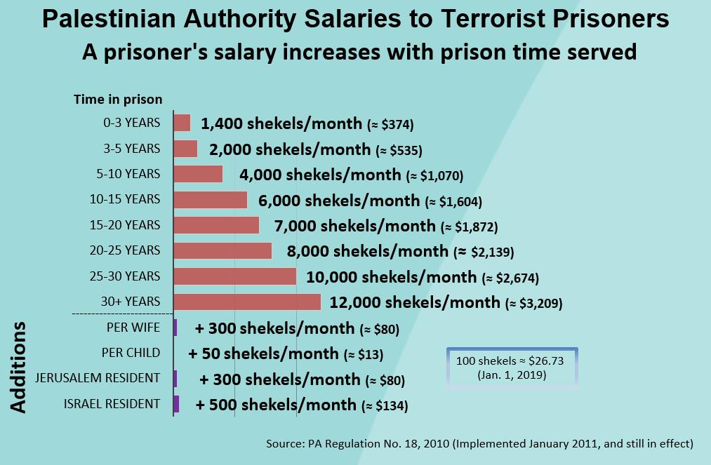The salaries the PA pays to terrorist prisoners increase the longer time a terrorist spends in prison. While the starting salary is 1,400 shekels/month, it increases over time to 12,000 shekels/month.