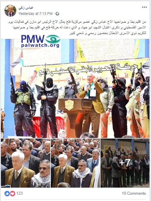 Posted text: “From the [Fatah] branch of Yatta and its suburbs, Fatah Central Committee member Abbas Zaki represents [PA] President Mahmoud Abbas at events for Palestinian Prisoner’s Day and the anniversary of the assassination of Martyr (Shahid) Abu Jihad (i.e., terrorist responsible for the murder of 125 Israelis), which the Fatah Movement at the branch of Yatta and its suburbs organized in order to honor the heroic prisoners’ relatives amid great official and popular attendance.”