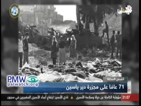 Text on screen: “Occupied Jerusalem – 71 years since the Deir Yassin massacre (see note below –Ed.)”