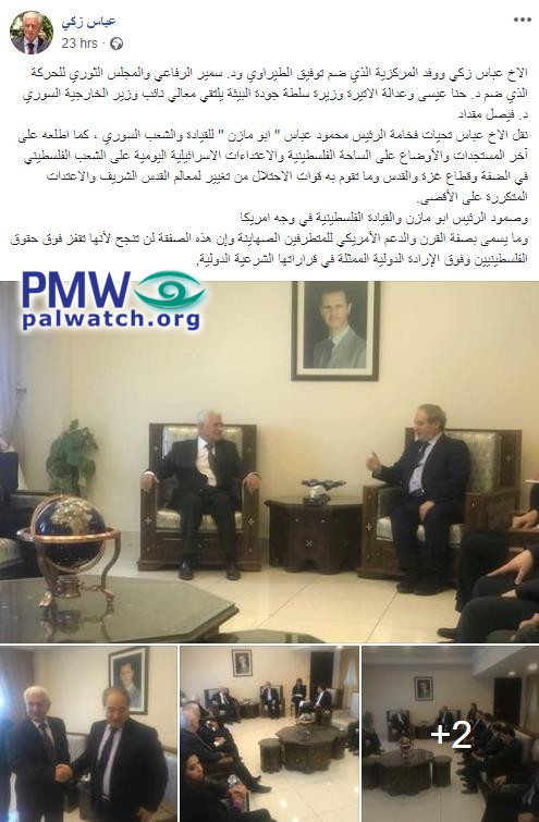Brother Abbas [Zaki] conveyed the greetings of His Honor [PA] President Mahmoud Abbas to the Syrian leadership and people. He also briefed him about the recent developments, the changing of Jerusalem’s landmarks by the occupation forces, the recurring attacks against the Al-Aqsa Mosque, and the resolve of President Mahmoud Abbas and the Palestinian leadership against the US.”