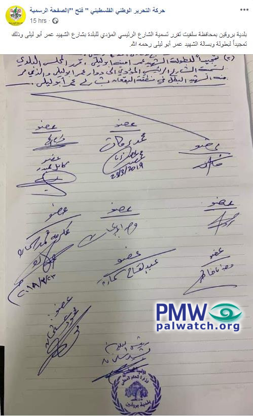 Posted text:“The Bruqin Municipality in the Salfit district decides to name the main street leading to the town ‘Martyr Omar Abu Laila Street,’ in order to glorify the heroism and courage of Martyr Omar Abu Laila, may Allah have mercy on him.”