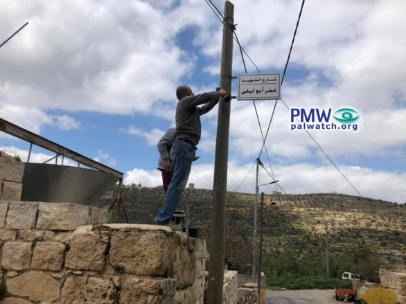 The picture shows a monument to terrorist Omar Abu Laila in Abwein. The monument features an image of Abu Laila and above it the Fatah logo that includes a grenade, crossed rifles, and the PA map of “Palestine” that presents all of Israel as “Palestine” together with the PA areas. On each side is an elongated Palestinian flag.