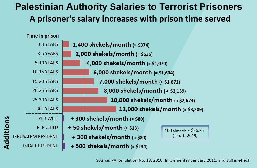 It was this dogma - to see murderers and other terrorists as soldiers of the PA - that brought the PA to institutionalize and establish, even in legislation, the entitlement of imprisoned and released terrorists to receive a monthly salary. It is this dogma that is behind the PA terrorist pay scale according to which the longer the terrorist is held in prison (similar to the worker who accumulates seniority in his workplace), the higher his salary.