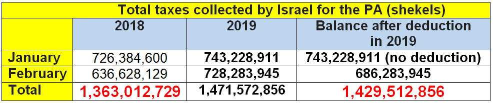 In January 2019, before the Cabinet's decision to make the deduction, the taxes collected for the PA amounted to more than 743 million shekels, and in February, the taxes collected amounted to more than 728 million shekels.